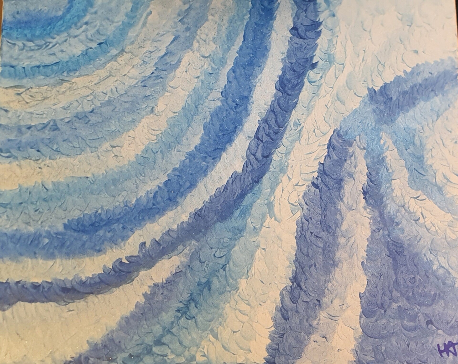 BlueLove, dit woord omschrijft alles wat dit schilderij is. Je wilt blijven kijken naar de blauwe kleurnuances in combinatie met het geschilderde patroon. Het geeft rust, maakt optimistisch en blij.